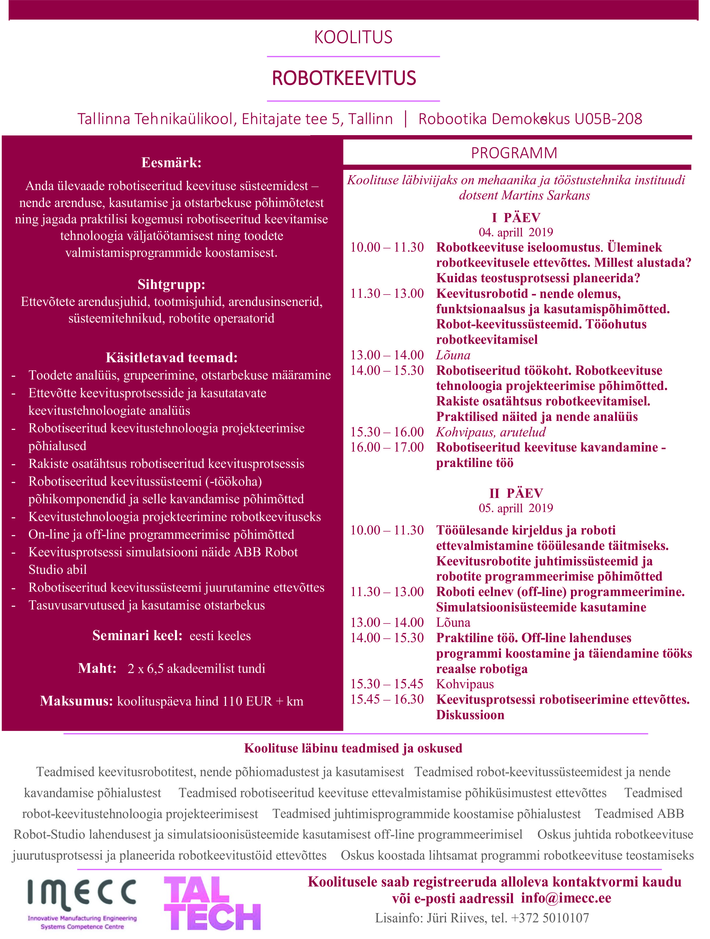 04. ja 05. aprillil 2019 viib IMECC koostöös Tallinna Tehnikaülikooliga läbi kahepäevase praktilise õppe robotkeevituse valdkonnas