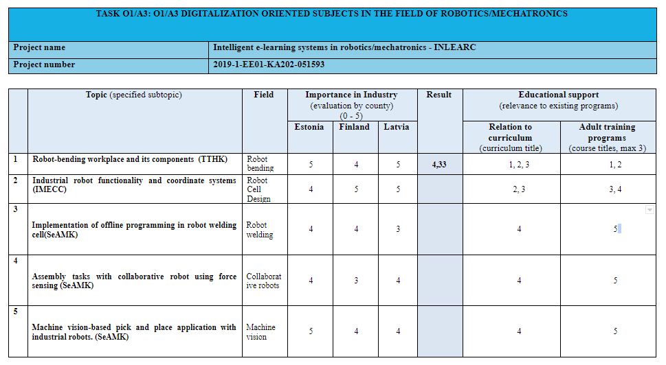 Tööstuse vajaduste alusel koostati õppe digitaliseerimisele suunatud teemade loetelu robootika ja mehhatroonika valdkonnas (O1-A3)