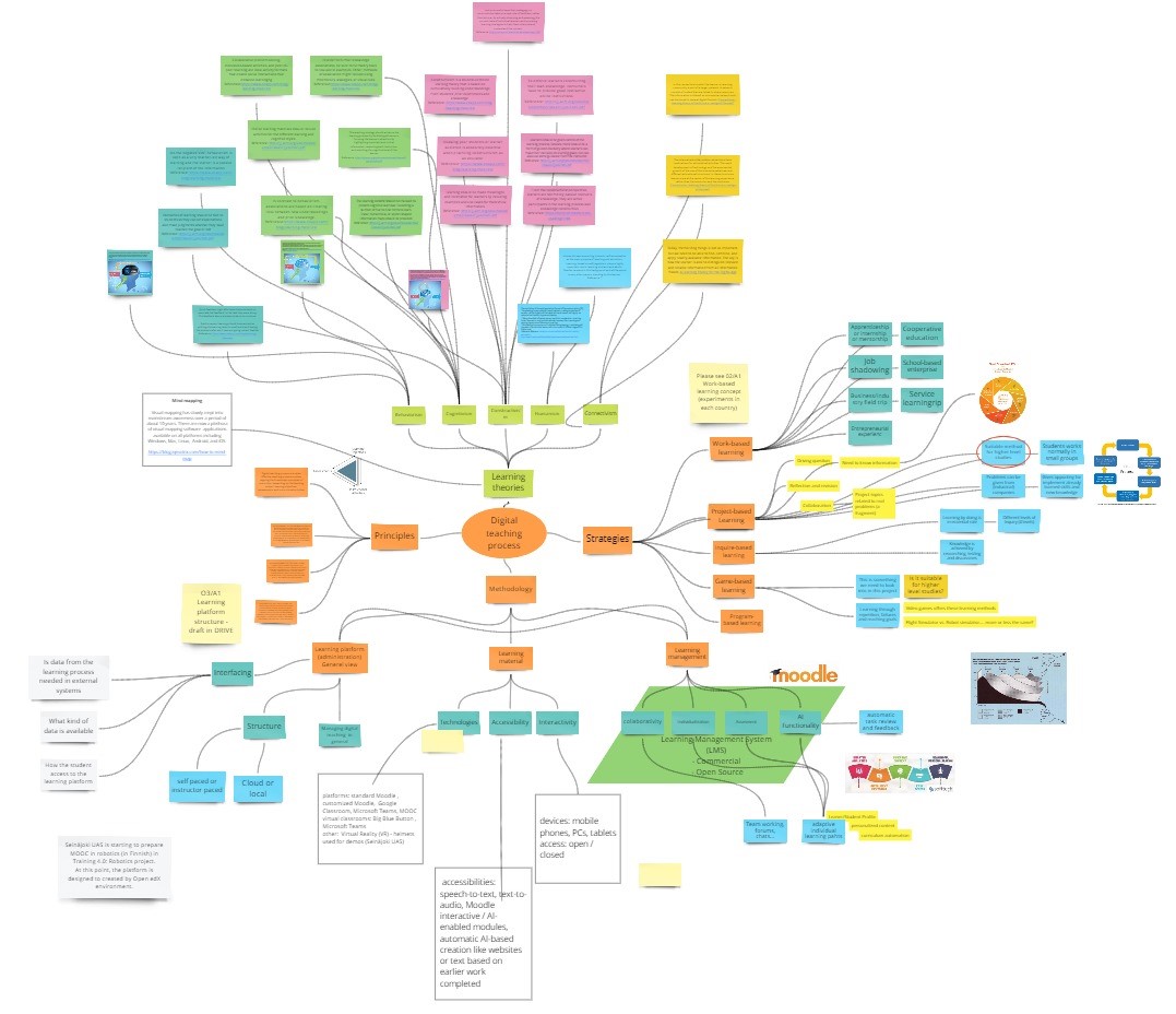 O1-A4 “Strateegia, meetodid ja põhimõtted digitaalse õppeprotsessi arendamiseks” toimusid partneri Seamk juhtimisel ning algasid ühise ideede kogumise tööga, et saavutada ühine vaade arendusprotsessi raamistikule. Koostöö korraldati kasutades Miro platvormi, mis on veebipõhine intuitiivne visuaalne tööriist reaalajas koostööks. Kolme töötoa käigus lõi projektimeeskond oma kogemustele ja teadmistele tuginedes digitaalse õpetamise arendusprotsessi põhjaliku skeemi (vajuta pildile, et näha suuremalt). Järgmiseks koondatakse kõik kogutud ideed aruandesse, mis tegevuse lõpetab.