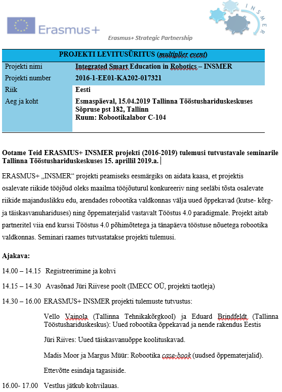 Ootame Teid ERASMUS+ INSMER projekti (2016-2019) tulemusi tutvustavale seminarile Tallinna Tööstushariduskeskuses 15. aprillil 2019.a.